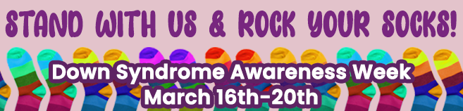 March 16th-20th, Join us in wearing your crazy, wacky, or fun statement socks! World Down Syndrome Day is Saturday March 21st (3/21) and we will be honoring it all week!